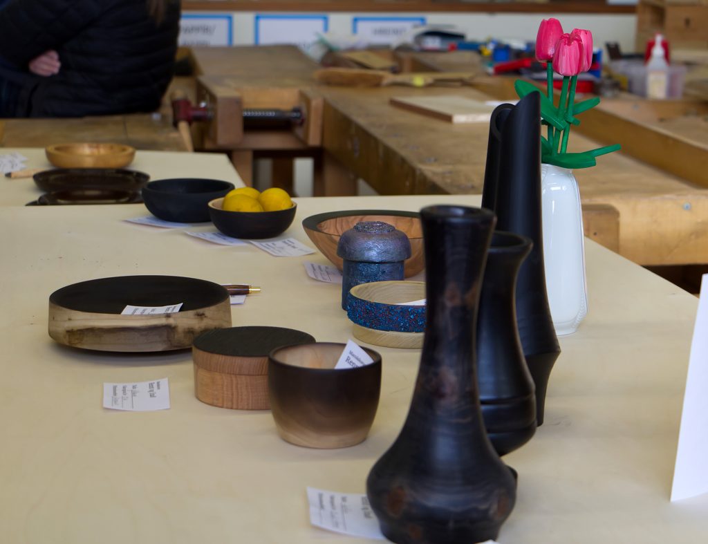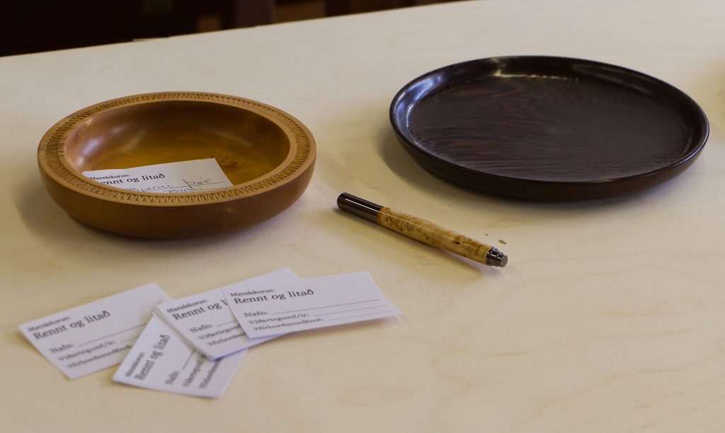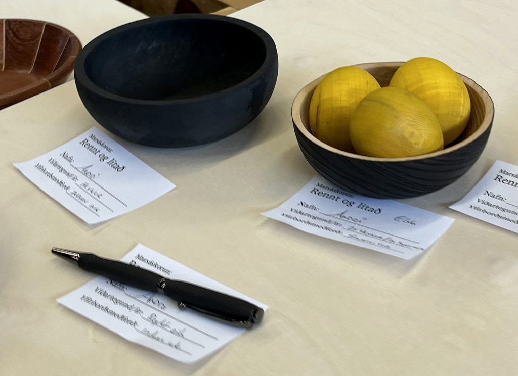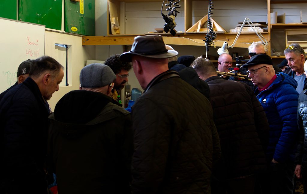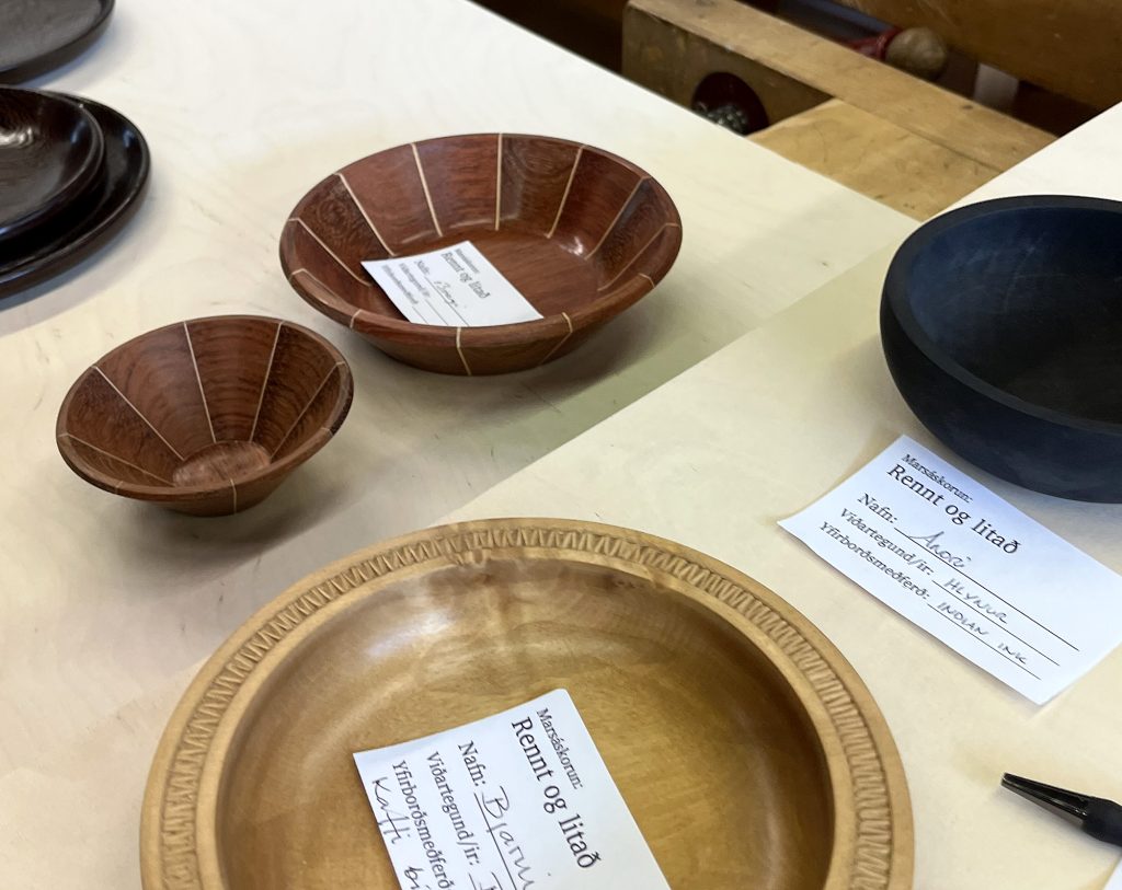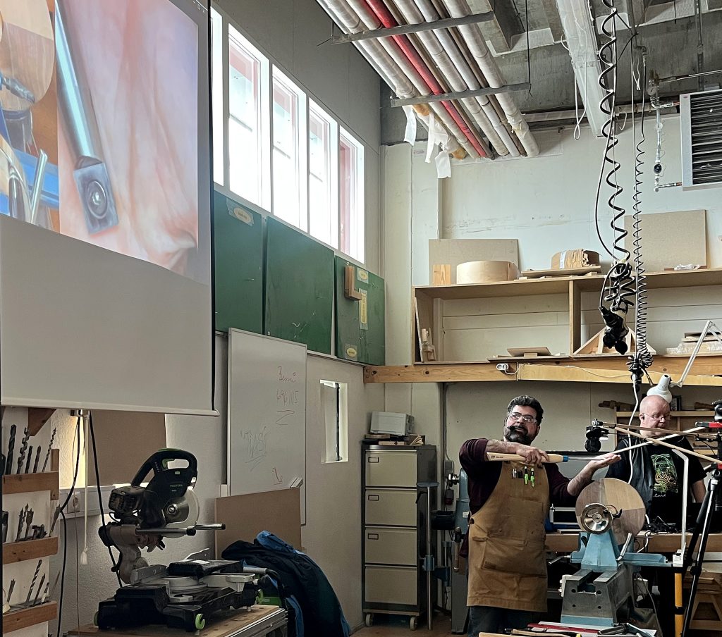 Eric sýndi okkur hvernig hann rennir skál úr flatri spýtu, með því að renna hringi sem má stafla og líma saman. Mjög áhugavert og vert að prófa. Eric var að sýna tæknina við að renna hringina sjálfa en hann mun svo líma þetta saman heima og sýnir okkur svo mynd af skálinni þegar hún er klár.