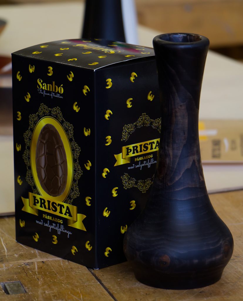 Hann ákvað að sýna okkur karbít-rennijárn til að vinna efnið niður en sú gerð er orðin ansi vinsæl í Bandaríkjunum. Eric lenti í smá vandræðum með bútjárnin en það reyndist vera of mikið bil milli hvílijárns og spýtunnar, að mestu leyti vegna kubba sem hann sýndi til að halda bútjárninu beinu og í réttri gráðu.